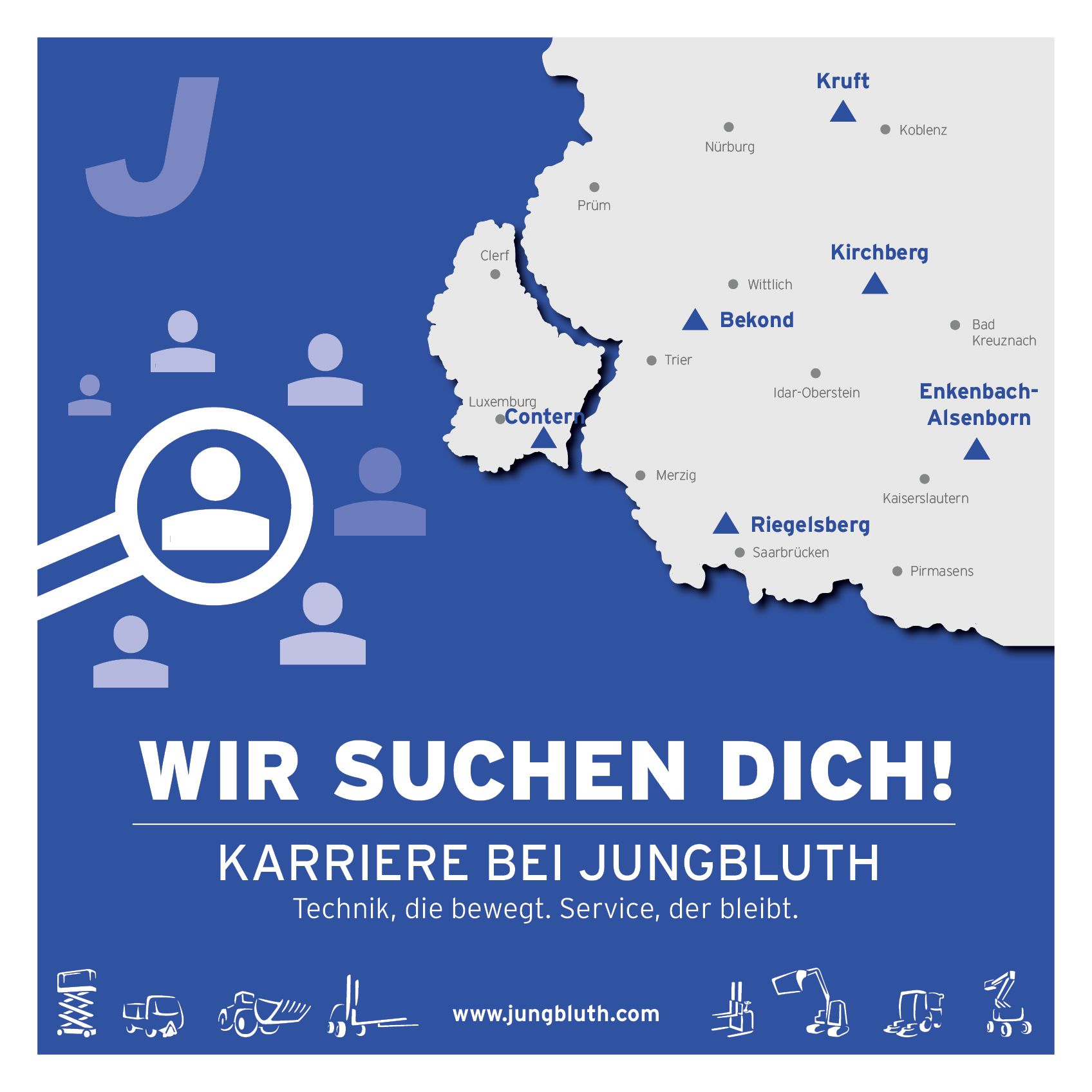 Seit mehr als 60 Jahren steht Jungbluth als familiengeführtes Unternehmen für zuverlässige Lösungen in den Bereichen Gabelstapler, Lagertechnik, Baumaschinen, Hubarbeitsbühnen sowie Reinigungs- und Kommunaltechnik. Als Komplettdienstleister ist unser Anspruch klar: maximaler Erfolg für unsere Kunden in Rheinland-Pfalz, dem Saarland und Luxemburg. Mit mehr als 280 engagierten Mitarbeitenden setzen wir täglich auf Qualität, Service und Kundenzufriedenheit – denn unser Team ist der Schlüssel zu unserem Erfolg.